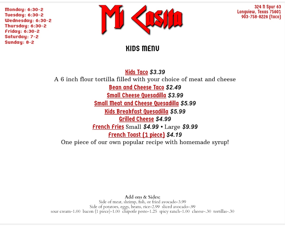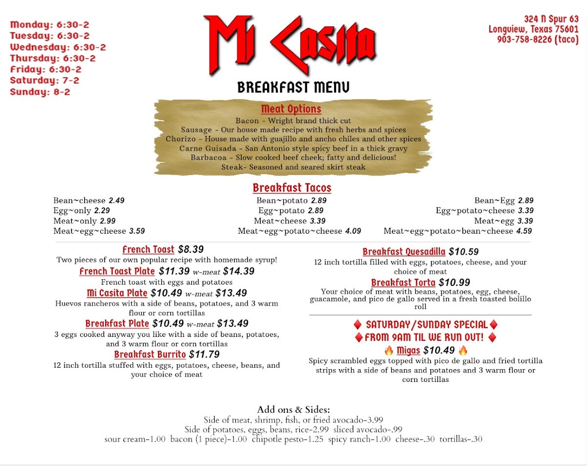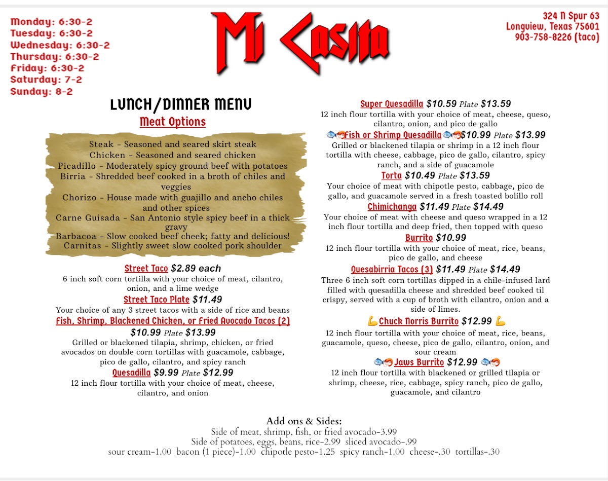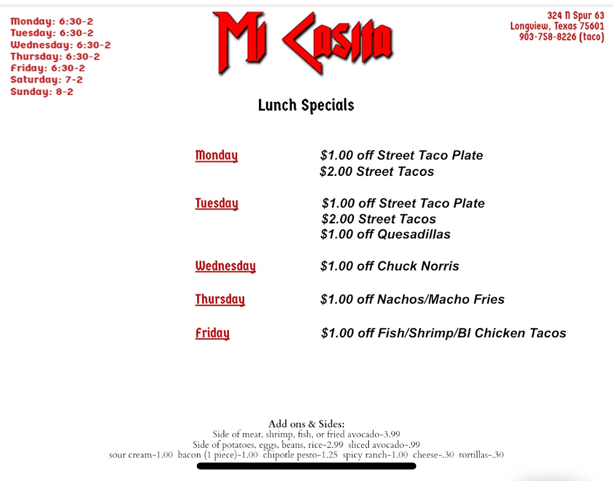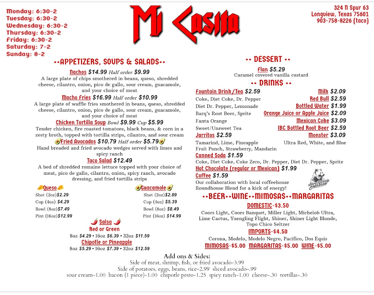 Welcome to Mi Casita, a delightful gem located at 324 N Spur 63 in Longview, TX. Known for its vibrant Tex-Mex offerings, this family-owned restaurant provides an authentic dining experience that keeps locals returning for more.